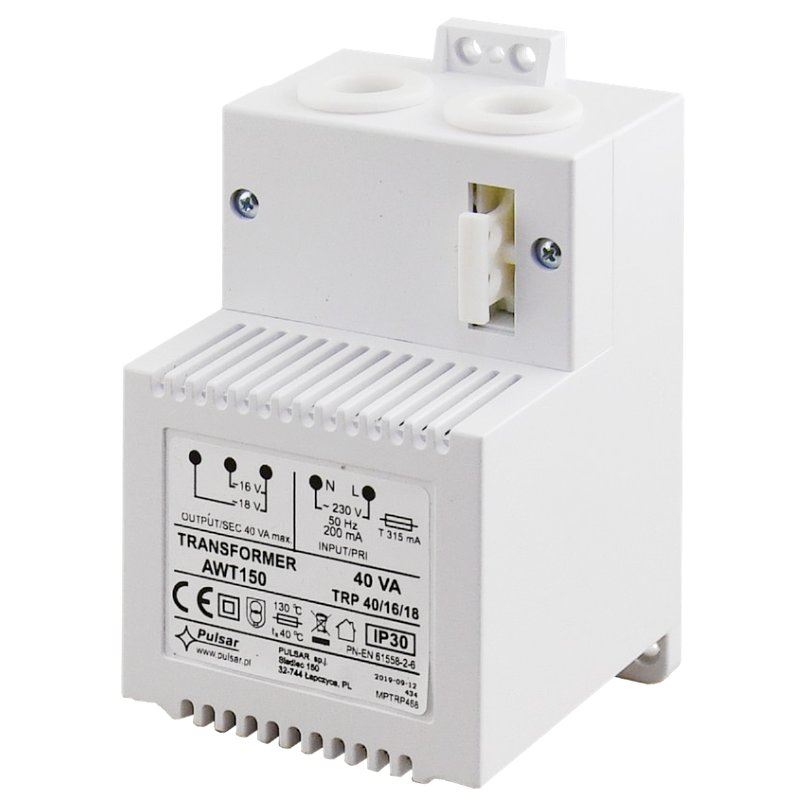 Transformator Pulsar AWT150 TRP 40/16/18 stosowany do zasilania: systemów alarmowych, automatyki, ogrzewania podłogowego. Może być stosowany do zasilania niskonapięciowej instalacji oświetleniowej. Podając na wejście napięcie 230V AC, na wyjściu możemy otrzymać 18V AC.