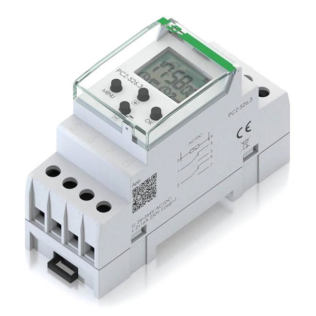 Zegar sterujący PCZ-526.4 16A astronomiczny dwukanałowy na szynę DIN TH35, z przerwą nocną programowalną dla każdego kanału oddzielnie, pamięć stanu przekaźnika, bezprzewodowa komunik. NFC do programowania z aplikacji, zas.24V - 264V AC / DC, prąd 2x16A