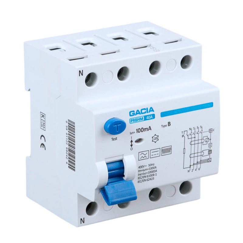 Wyłącznik różnicowoprądowy PR8HM TYP B to elektryczne urządzenie zabezpieczające, do obwodów zasilających falowniki (przekształtniki energoelektroniczne) oraz wszystkich instalacjich, w których można się spodziewać prądów różnicowych stałych wygładzonych.