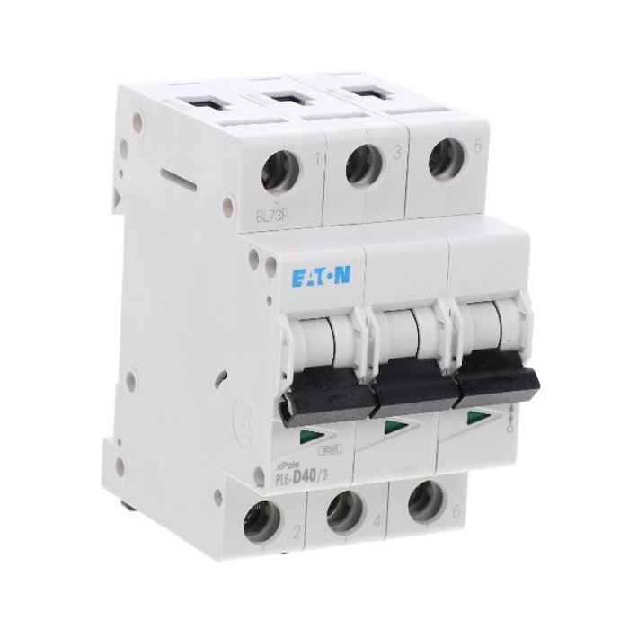 Wyłączniki nadprądowe znajdują zastosowanie w budownictwie mieszkaniowym i użyteczności publicznej, a także w przemyśle. Chronią instalację elektryczną przed skutkami zwarć oraz przeciążeń.. Wyłącznik nadprądowy 6kA, In=40A, char. D, 3-bieg. seria PL6, PL6-D40/3
