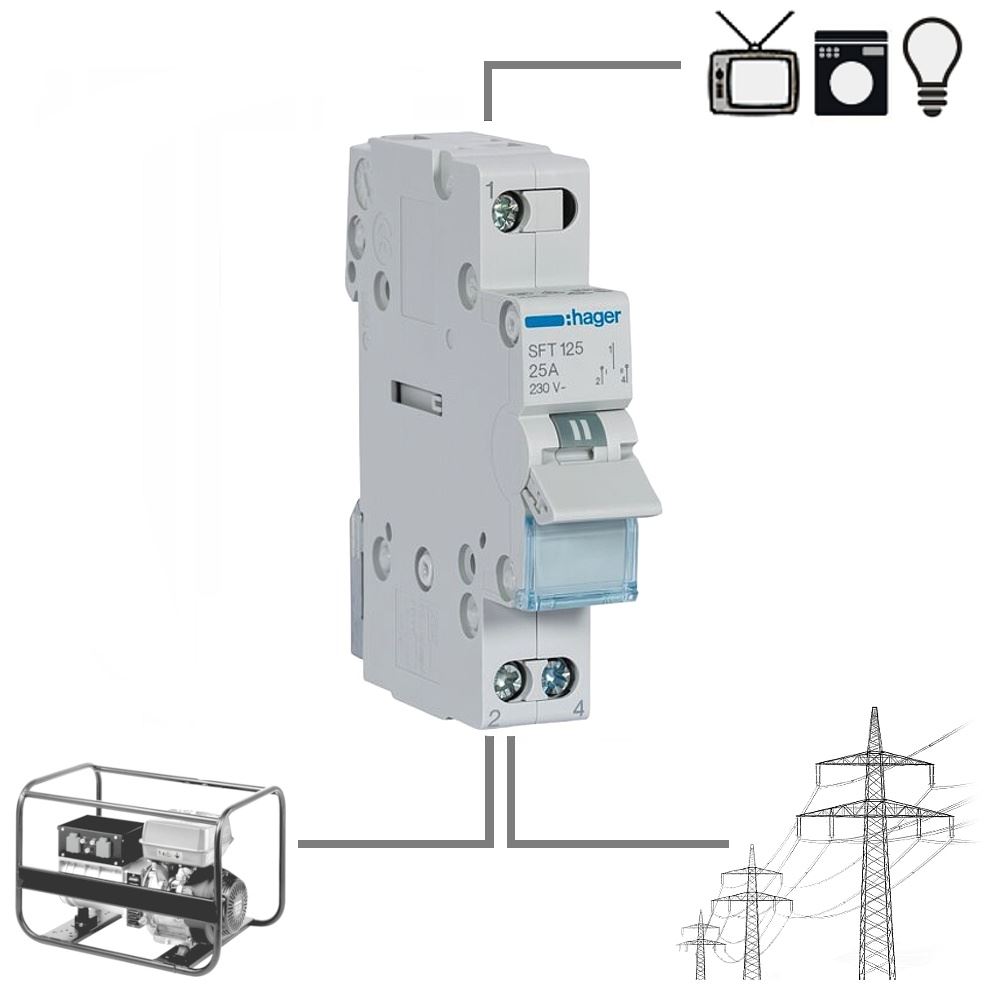 Przełącznik 1-fazowy SFT125 25A stosowany w celu przełączania zasilania 230V AC Sieć-Agregat 1-fazowy, czyli wyboru zasilania: podstawowe i rezerwowe do awaryjnego utrzymania napięcia w budynku po braku napięcia w sieci energetycznej.