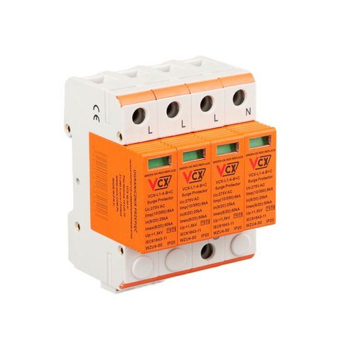 Dedykowane są do ochrony instalacji zasilających nN przed skutkami przepięć indukowanych i łączeniowych. Powinny być stosowane jako jednocześnie pierwszy i drugi stopień ochrony w tablicach piętrowych, podrozdzielniach. Ochronniki zamontowane winny być się w miejscach wprowadzeń instalacji elektrycznej do budynku. Zapewniają kompletną ochronę instalacji elektrycznej oraz zasilanych z niej urządzeń elektrycznych przed działaniem części prądu piorunowego oraz innego rodzaju przepięciami. Redukują przepięcia i sprowadzają do ziemi prądy udarowe pochodzące od obu rodzajów przepięć – bezpośrednich oraz pośrednich. Zapewniają jednocześnie dwustopniowy poziom ochrony. Stosowanie modułowych ochronników przepięć VCX-L1-B+C 6kA klasy T1T2 nie wymaga używania dławików odsprzęgających. Zapewniają skuteczną ochronę komputerów, urządzeń RTV/AGD i itp. Wyposażone są w wizualny wskaźnik działania (zielony – ochrona, czerwony – brak ochrony).
