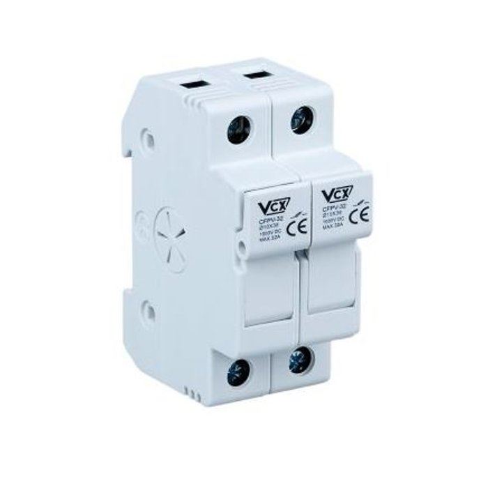 Podstawa gniazdo bezpieczników fotowoltaicznych VCX-PV DC 10x38mm 2Pdo montażu w instalacja fotowoltaicznych. Rozłączana w stanie bezprądowym, nie zawiera bezpieczników