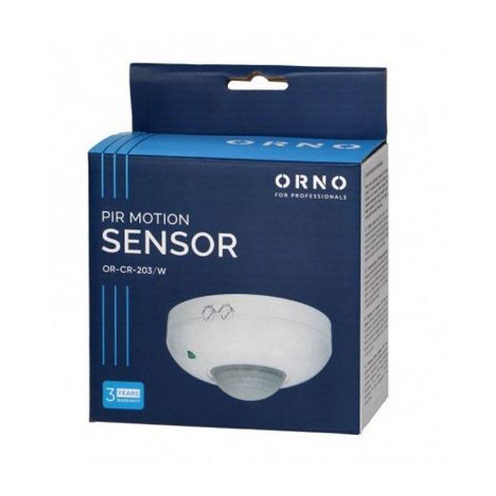 Oświetlenie jest włączane za pomocą czujnika ruchu PIR, który działa na promieniowanie podczerwone. Czujka ruchu PIR współpracuje z oświetleniem opartym na technologii LED. Na zewnątrz obudowy posiada pokrętła do regulacji czasu świecenia (TIME) i czułości natężenia światła (LUX). Czas świecenia regulować można min: 10 sek.±3 sek., a max: 7 min.±2 min. Pracuje poprawnie przy natężeniu światła <3-2000 lux i temperaturze -20 do +40 st. C. Czujnik OR-CR-203/W wykonany jest z tworzywa sztucznego, w kolorze białym. Zasięg pracy czujnika to 6m, a kąt: 360s topni. Wymaga stałego zasilania o napięciu 230V i max obciążeniu 1200W.