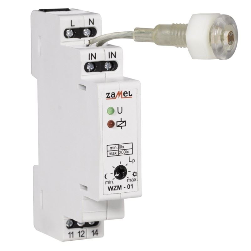 Wyłącznik zmierzchowy WZM-01 służy do sterowania urządzeniami oświetleniowymi lub innymi odbiornikami energii w zależności od natężenia oświetlenia. Układ załącza oświetlenie o zmierzchu i wyłącza o świcie. Próg załączenia może być płynnie nastawiony przez użytkownika. Układ jest odporny na krótkotrwałe zmiany natężenia oświetlenia co gwarantuje niezawodność pracy. Zewnętrzna sonda natężenia oświetlenia SOH z przewodem o maksymalnej długości 50 m umożliwia umieszczenie jej w dogodnych miejscach.