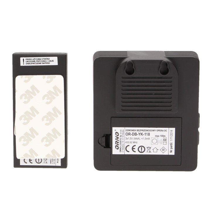 Dzwonek bezprzewodowy bateryjny OPERA DC czarny IP44 zasięg 100m 1x23A(12V),3x AAA(4,5V) 36 dźwięków dzwonka, przycisk wodoodporny