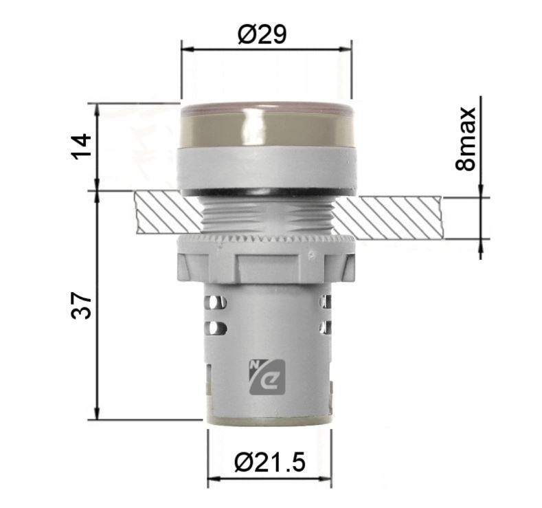 Kontrolka zasilania wkręcana w standardowy otwór 22mm w formie woltomierza napięcia przemiennego wbudowanego w przednią część kontrolki. Barwa świecenia dobrana do koloru kontrolki. Zasilanie napięciem przemiennym z zakresu 60V do 500V podłączane jest przewodami bezpośrednio pod zaciski skręcane X1 i X2.