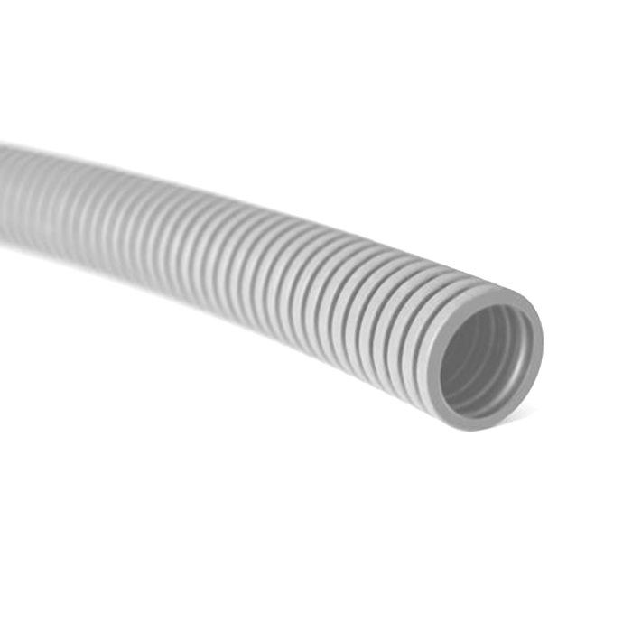Rura instalacyjna, karbowana, giętka, nie rozprzestrzeniająca płomienia wykonana z PCV w kolorze szarym (RAL7035), ze stalowym pilotem ułatwiającym przeciąganie przewodów.