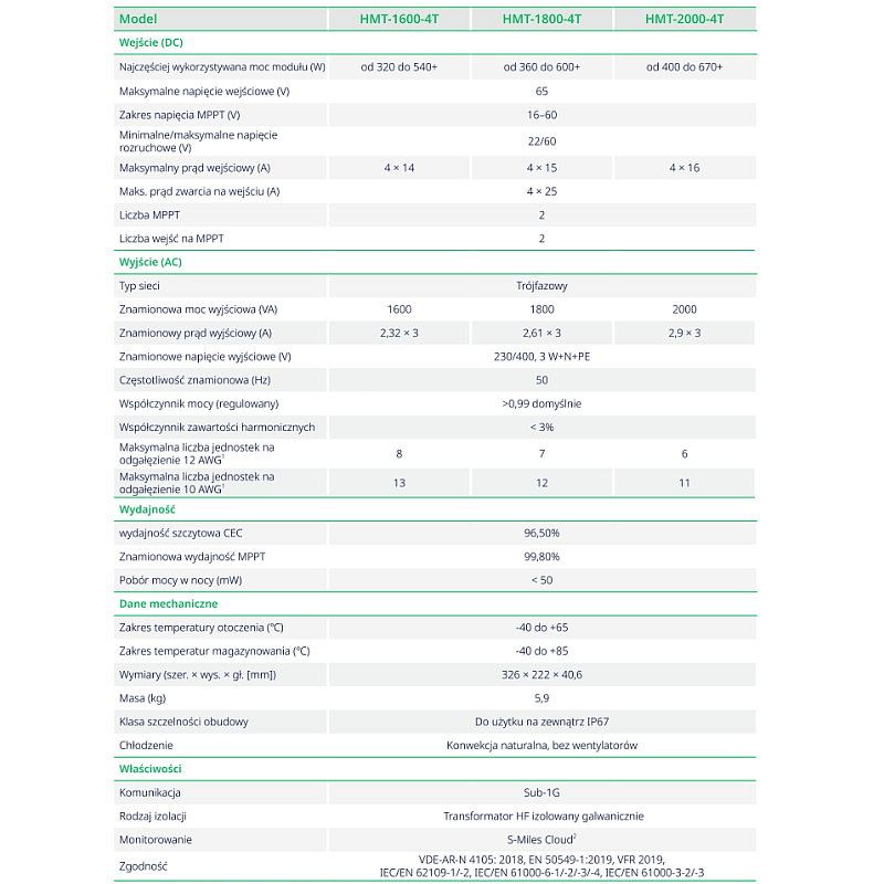 Nowa generacja mikroinwerterów Hoymiles serii HMT-1800 została zaprojektowana z myślą o modułach fotowoltaicznych dużej mocy. Posiada maksymalną moc wyjściową do 1800 VA i maksymalny prąd wejściowy DC do 16A.