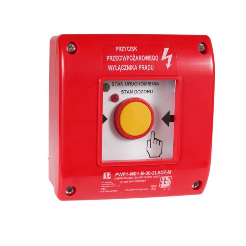 Ręczny przycisk ma zadanie uruchomić "Przeciwpożarowy wyłącznik prądu", który odłączy zasilanie budynku od źródła energii elektrycznej podczas pożaru w czasie akcji ratowniczej. Przeciwpożarowy wyłącznik prądu,odcinający dopływ prądu do wszystkich obwodów,z wyjątkiem obwodów zasilających instalację i urządzenia,których funkcjonowanie jest niezbędne podczas pożaru, należy stosować w strefach pożarowych o kubaturze przekraczającej 1000 m³ lubzawierających strefy zagrożone wybuchem.