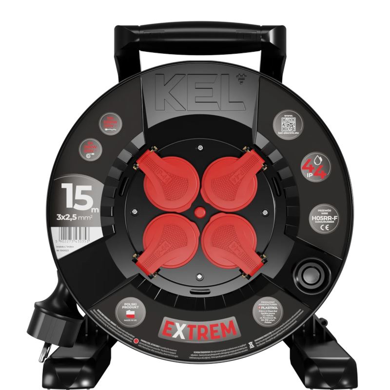 Przedłużacz bębnowy H05RR-F 3x2,5/15M IP44 4x2P+Z 16A czarny, przewód, kabel zwijany na bębnie