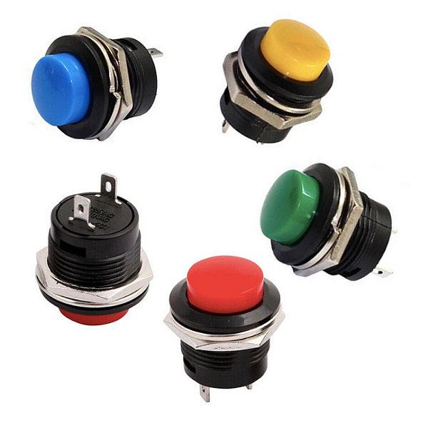 Przycisk chwilowy R13-507 niebieski 250V-3A PB-02 16mm monostabilny okrągły NO zwierny 2 pin przykręcany do obudowy, kolory czerwony, zielony, niebieski, zółty, typ Reset