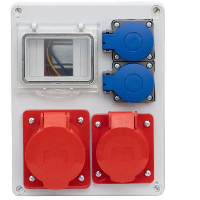 Rozdzielnica R-240 4M 16/5,32/5,2x230V natynkowa wyposażona w 1 gniazdo 16A 5P 3-fazowe + 1 gniazdo 32A 5P 3-fazowe + 2 gniazda 230V zamykane klapką + miejsce na montaż aparatów elektroinstalacyjnych