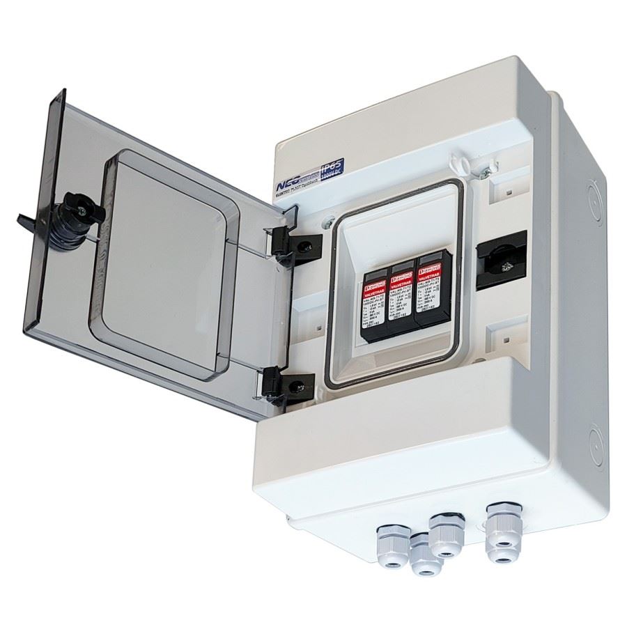 Rozdzielnica fotowoltaiczna DC przeznaczona do zabezpieczenia 1 łańcucha DC, wyposażona w 1 ogranicznik przepięć typu T1/T2 renomowanej marki PhoenixContact, dławiki PG9 do wyprowadzenia przewodów DC 4 lub 6mm2 oraz uziemienia.
