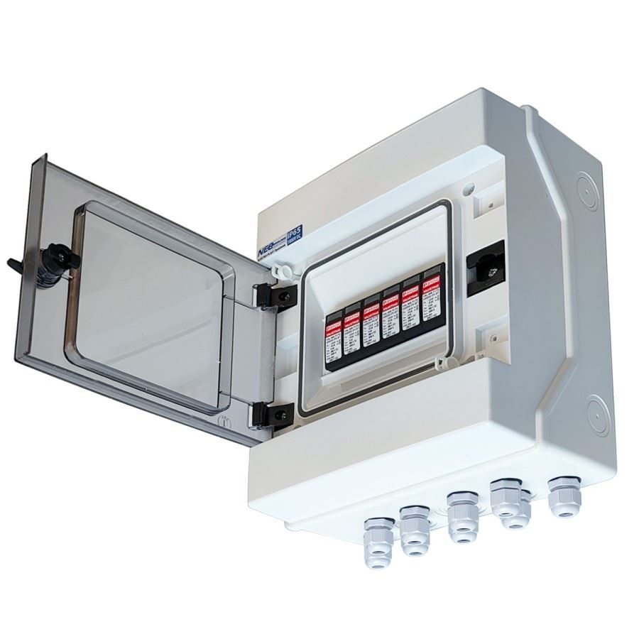 Rozdzielnica fotowoltaiczna DC przeznaczona do zabezpieczenia 2 łańcuchów DC, wyposażona w 2 ograniczniki przepięć typu T1/T2 renomowanej marki PhoenixContact, dławiki PG9 do wyprowadzenia przewodów DC 4 lub 6mm2 oraz uziemienia.