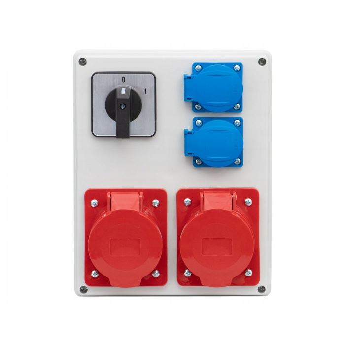 Rozdzielnica R-240 16/5,32/5,2x230V natynkowa wyposażona w 1 gniazdo 16A 5P 3-fazowe + 1 gniazdo 32A 5P 3-fazowe + 2 gniazda 230V zamykane klapką