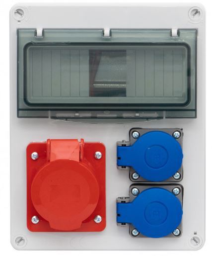 Rozdzielnica R-240 8M 16/5,2x230V natynkowa wyposażona w 1 gniazdo 16A 5P 3-fazowe + 2 gniazda 230V zamykane klapką + miejsce na montaż aparatów elektroinstalacyjnych