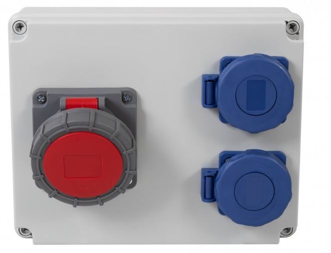 Rozdzielnica R-240 32/5,2x230V IP65 natynkowa wyposażona w 1 gniazdo 32A 5P 3-fazowe + 2 gniazda 230V zamykane klapką