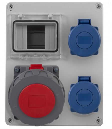 Rozdzielnica R-240 4M 32/5,2x230V IP65 natynkowa wyposażona w 1 gniazdo 32A 5P 3-fazowe + 2 gniazda 230V zamykane klapką + miejsce na montaż aparatów elektroinstalacyjnych