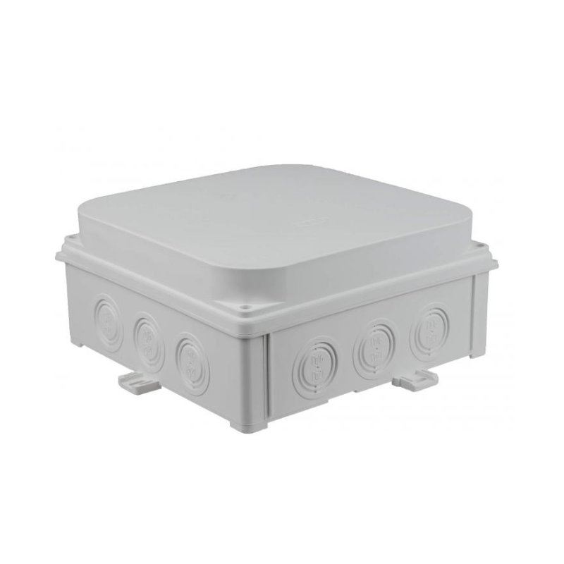 Puszka naścienna 188x188X88 mm, bezhalogenowa, samogasnąca, odporna na UV, IP67, UL94 V0, N180x180S szara KLASA PALNOŚCI: UL94 V0 / 12 osłabień pod dławnice kablowe, gwintowe PG16 (o 23 mm) i PG21 (o 29 mm); 4 wkręty kwasoodporne. Tworzywo samogasnące