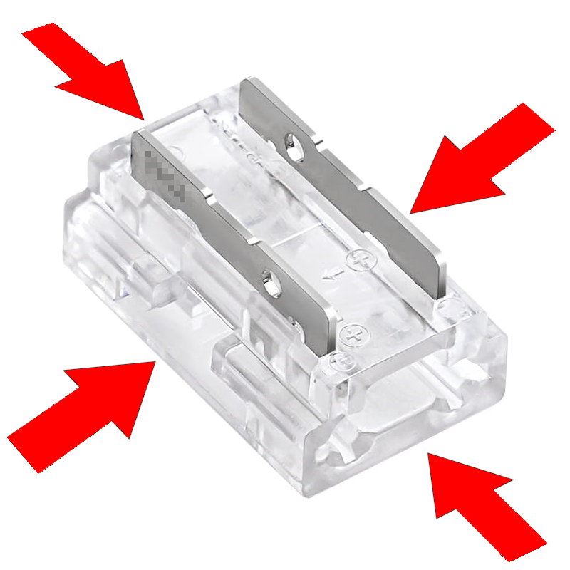 Przebijające elementy po zaciśnięciu wbijają się w miedziane części ścieżek taśmy LED lub żył przewodów zasilających.