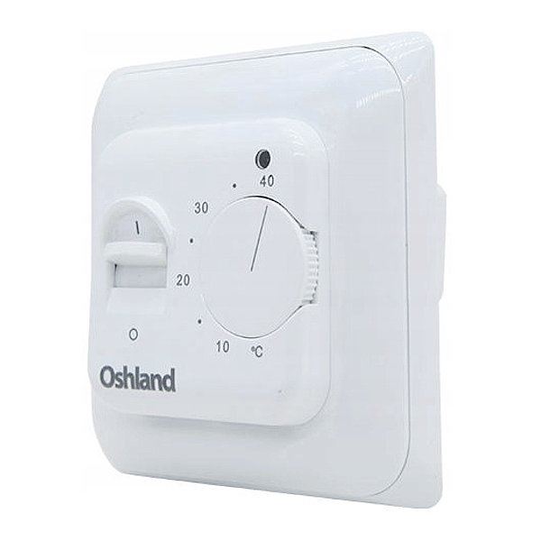 Termostat ścienny, pokojowy, analogowy M5. 716B biały, do folii i mat grzewczych. Podaje zasilanie 230VAC / 16A max z potencjometrem / pokrętlem Oshland. Czujnik temp.w kpl.