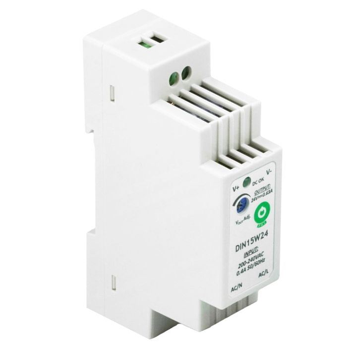 Zasilacz DIN15W24 24VDC / 15W / 0,63A na szynę DIN TH35, zasilanie 200-240V AC, regulacja napięcia wyjściowego DC