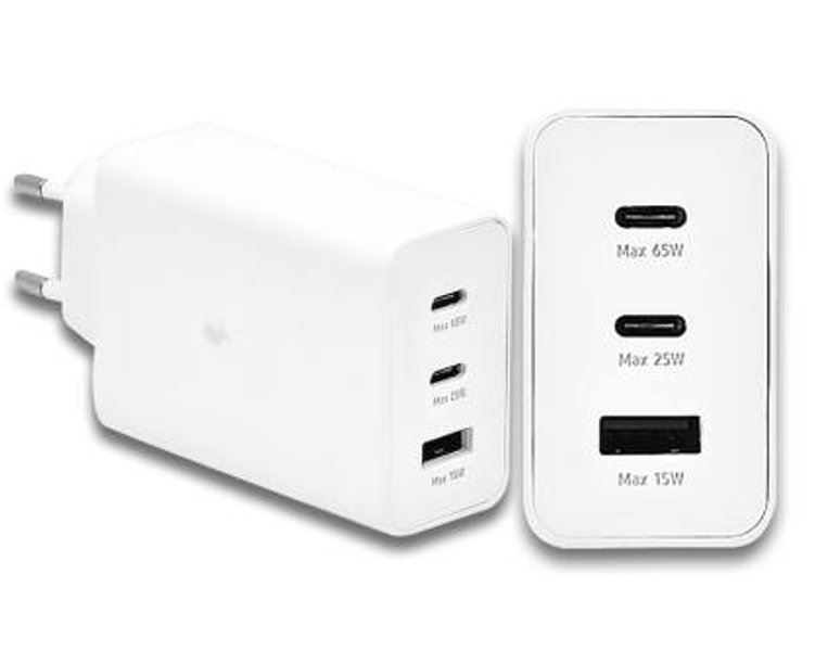 Ładowarka z technologią Power Delivery 65W Technologia Power Delivery i PPS. Ładowarka posiada 3 porty - 2 porty USB-C i port USB, biała lub czarna